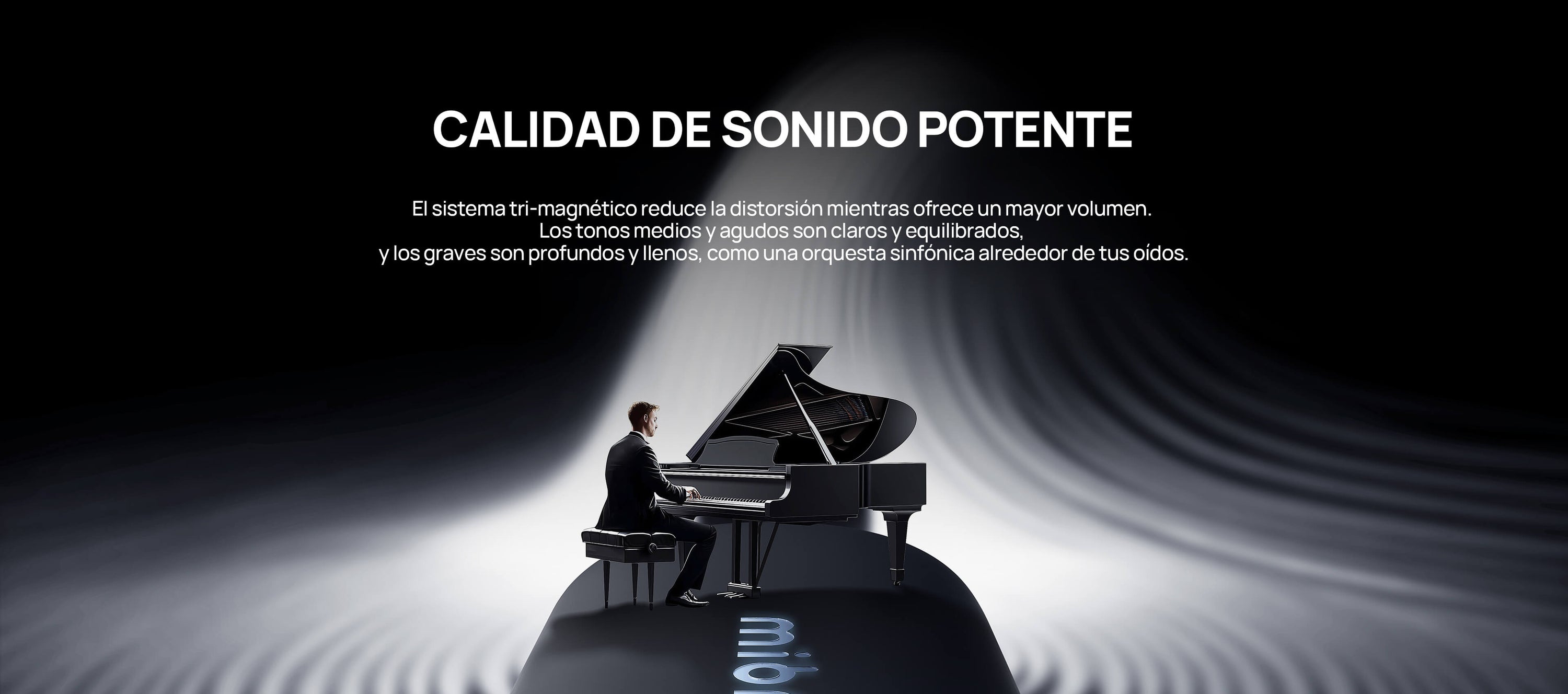 Tecnología acústica abierta mantiene sonidos ambientales. Agujeros únicos minimizan fugas. Medios y agudos claros, graves potentes.