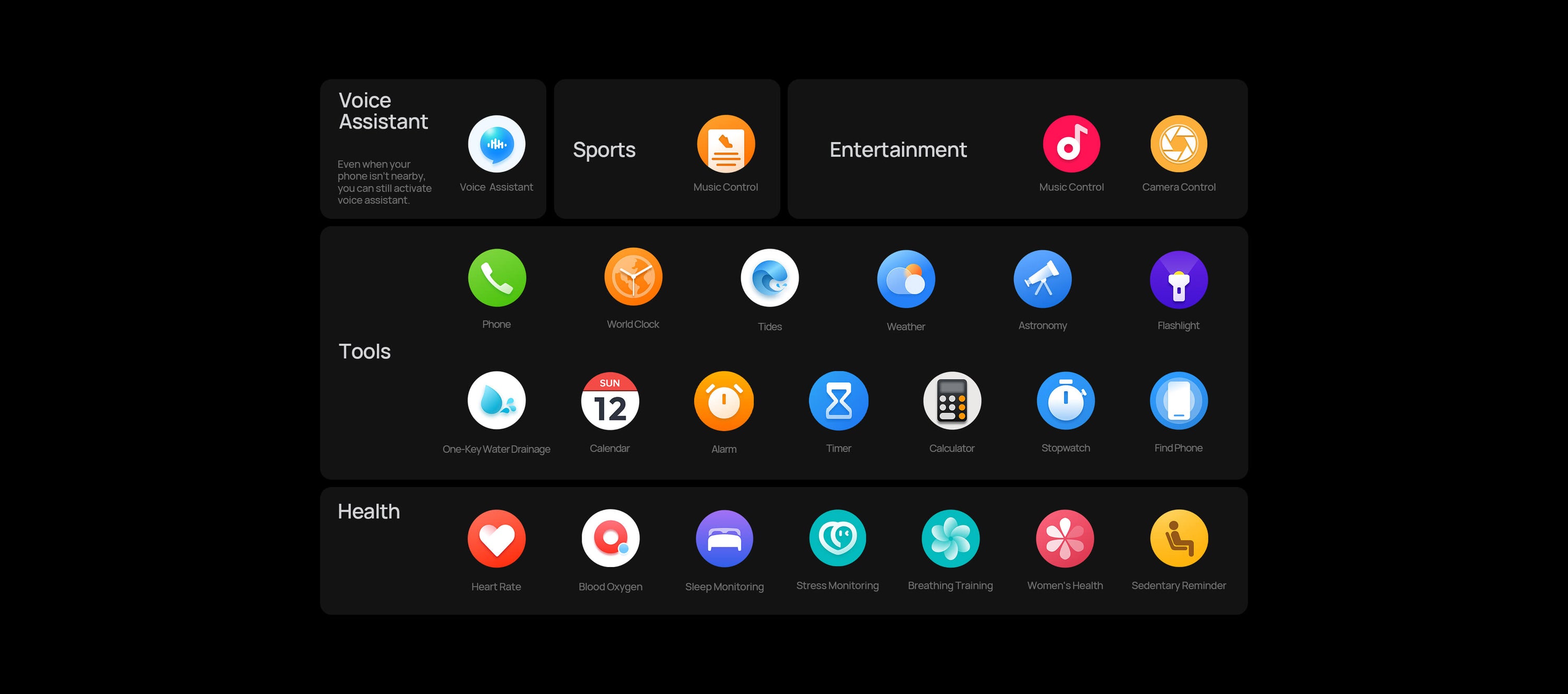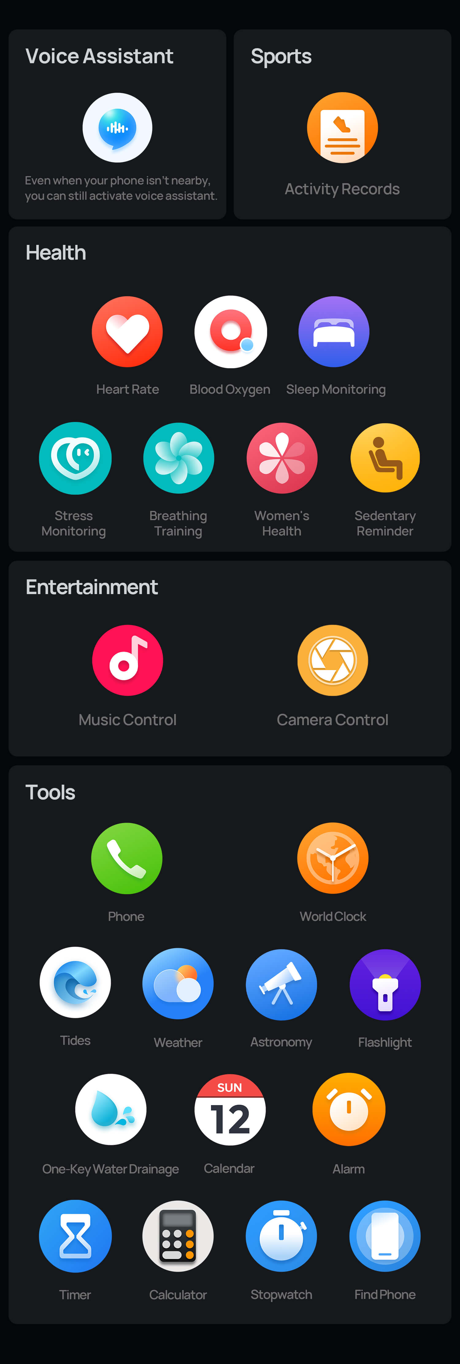 Heart Rate,SpO2,Motions record,Breath,Preesure,Sleepping record,AI Intelligent Assistant, AI Schedule,AI Watch Face,One click drainage,Timer,Alarm,Stop watch,Calculator,Calendar,Weather,Women's health,Find your phone,Bluetooth call, Music control, Music playing,App message reminder,Incoming call reminder,Health Reminder..