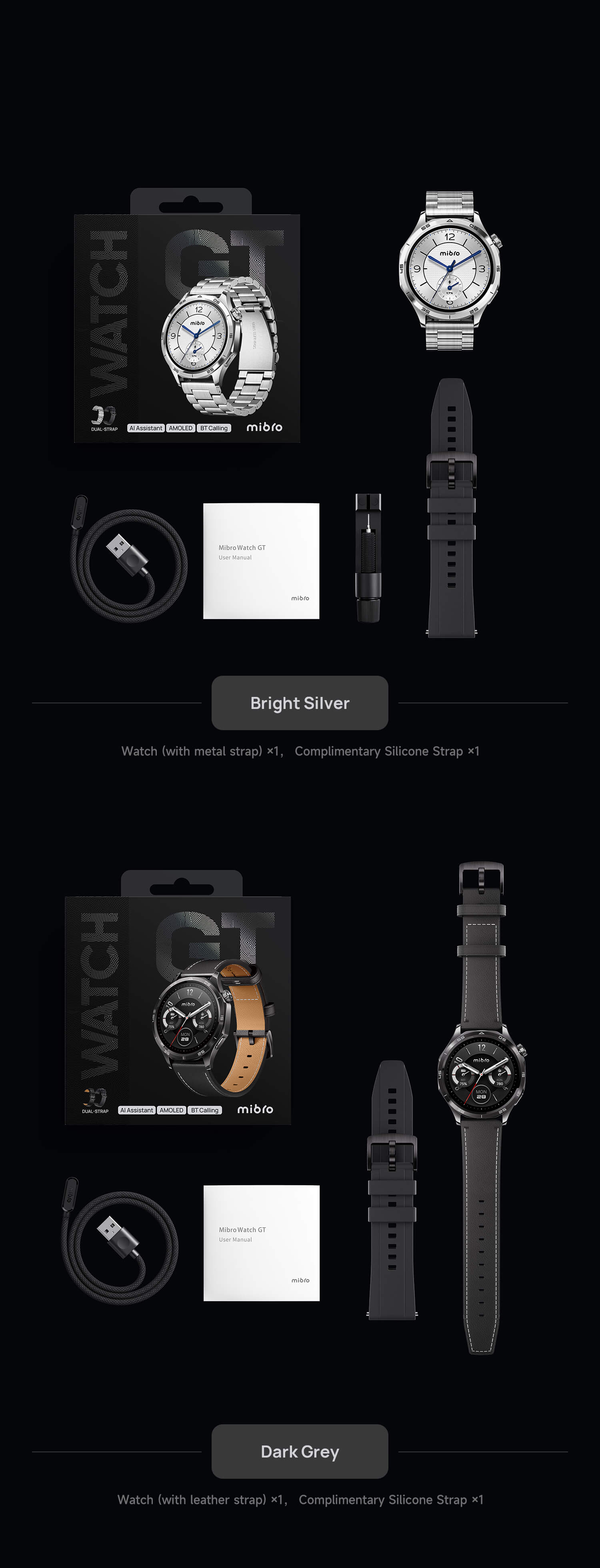 Includes one black leather strap, one black silicone strap, and one charging cable.