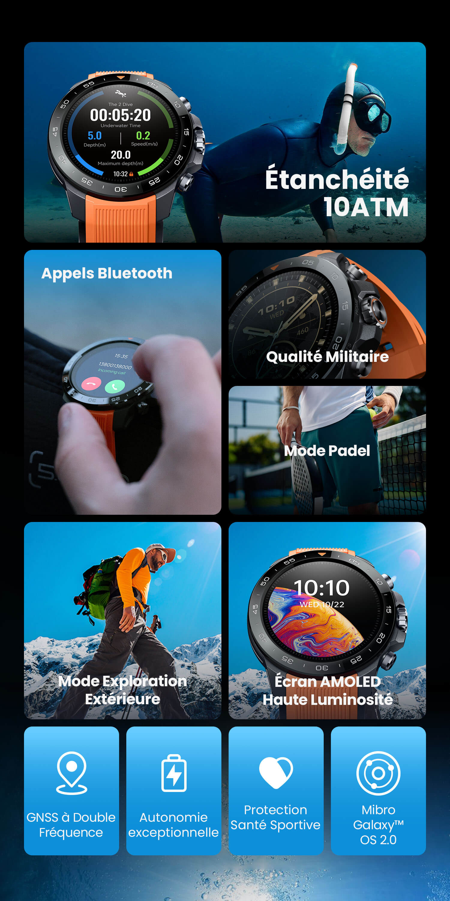 Autonomie massive : 20 jours (utilisation quotidienne), 50 jours (mode base), 25h GPS ou 9h d'appels. Mibro Galaxy OS 2.0 offre une personnalisation avancée (50+ cartes de données), synchronisation avec Strava/Apple Health/Google Fit et prend en charge 150+ modes sport, dont l'analyse des coups au Padel.
