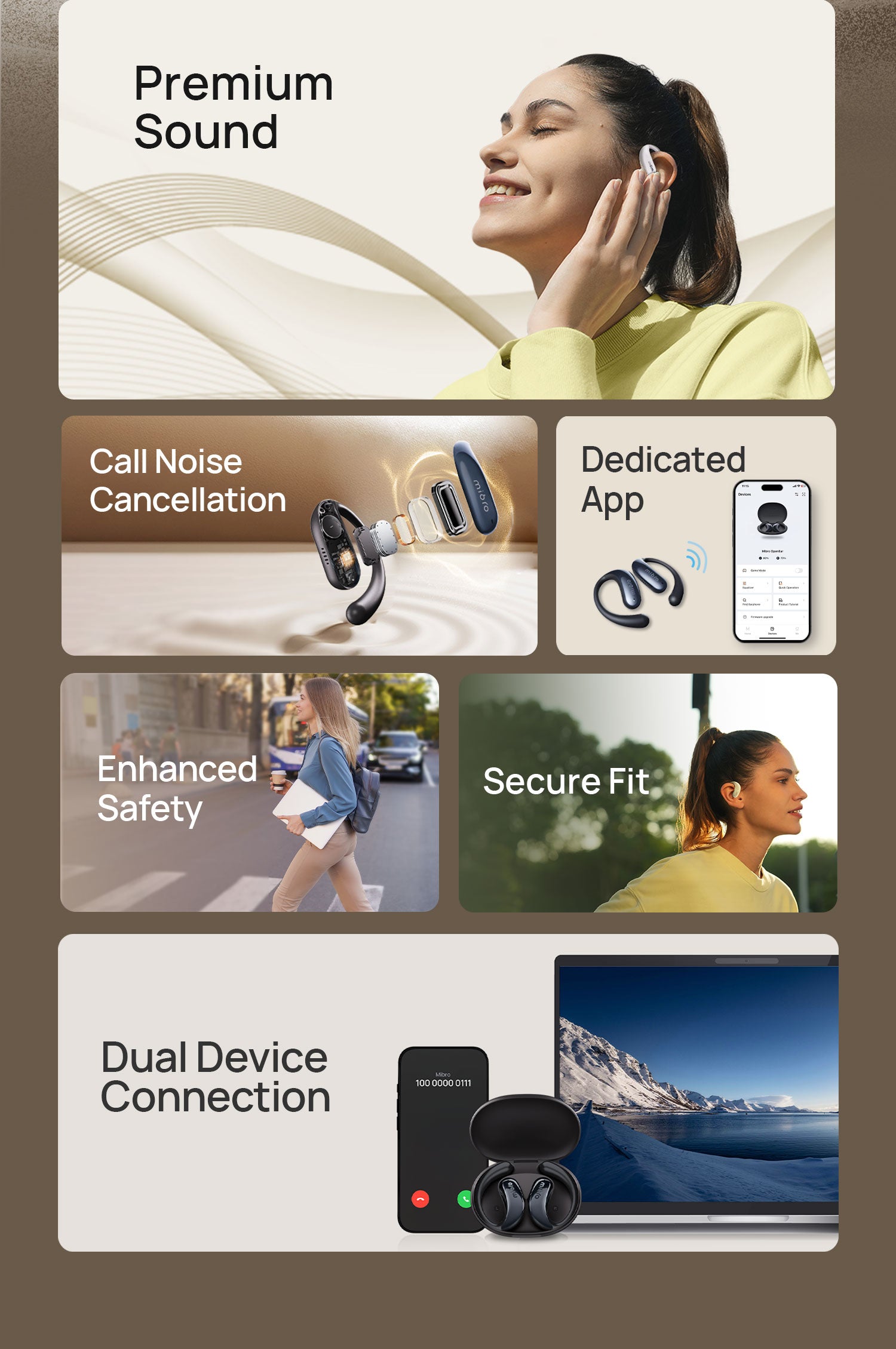 Non-in-ear structure with Mobius curve support and TPEE ear hooks ensures secure fit during intense workouts while maintaining environmental awareness. Ceramic-coated surface resists sweat and slippage.