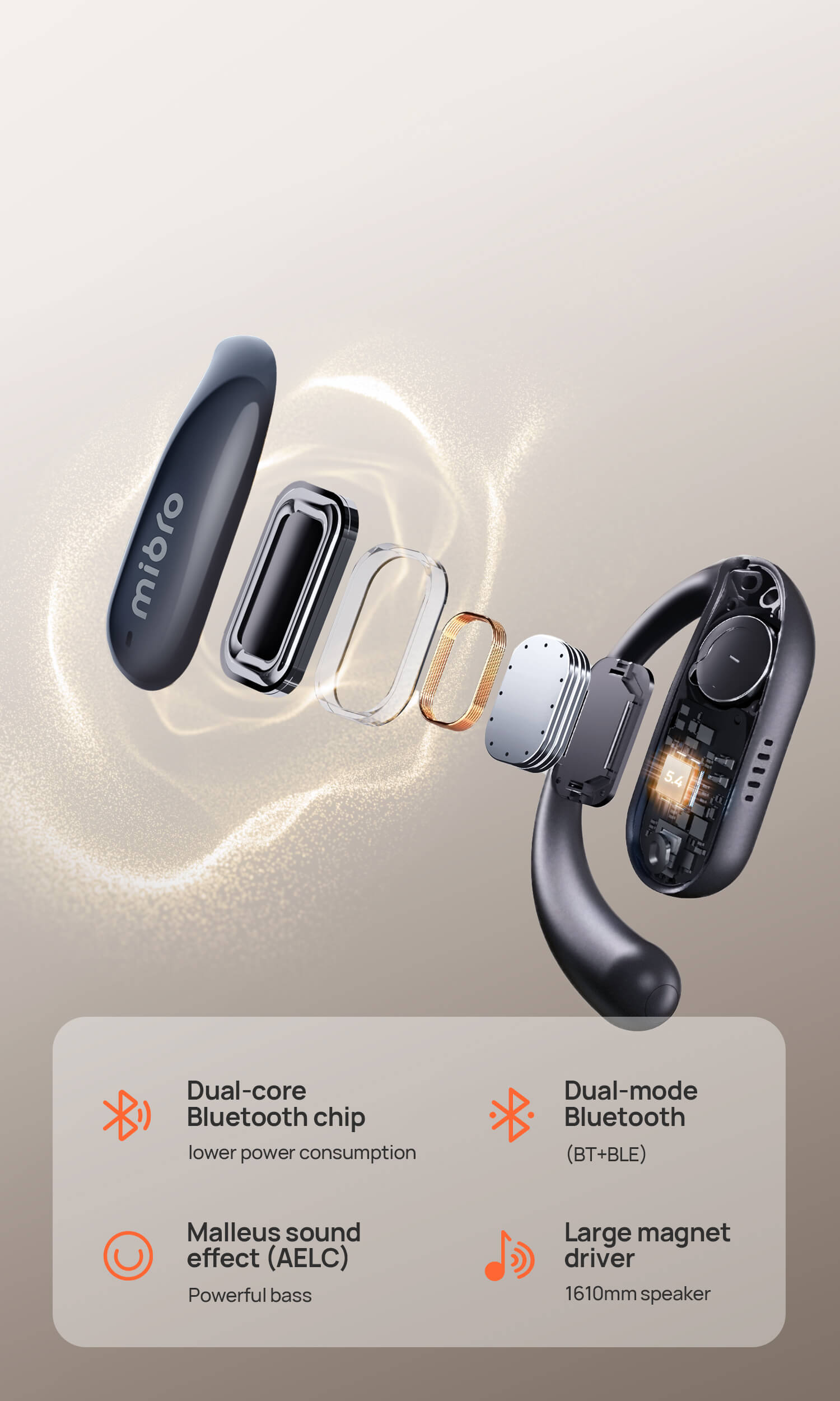 16.1mm large magnet driver via AELC Malleus sound tech. Dual-core Bluetooth chip optimizes audio/power efficiency.