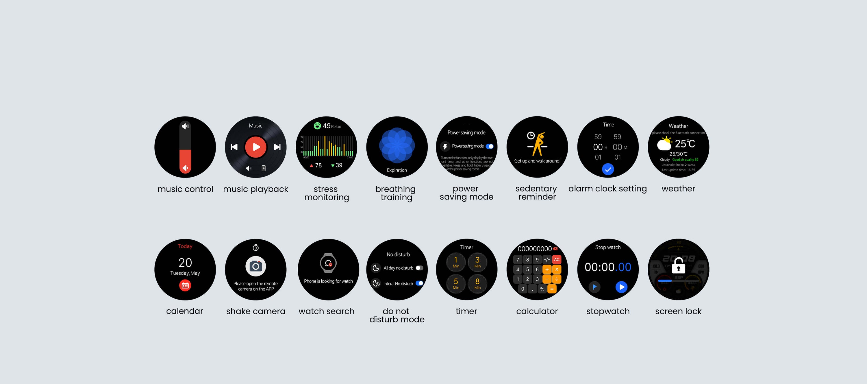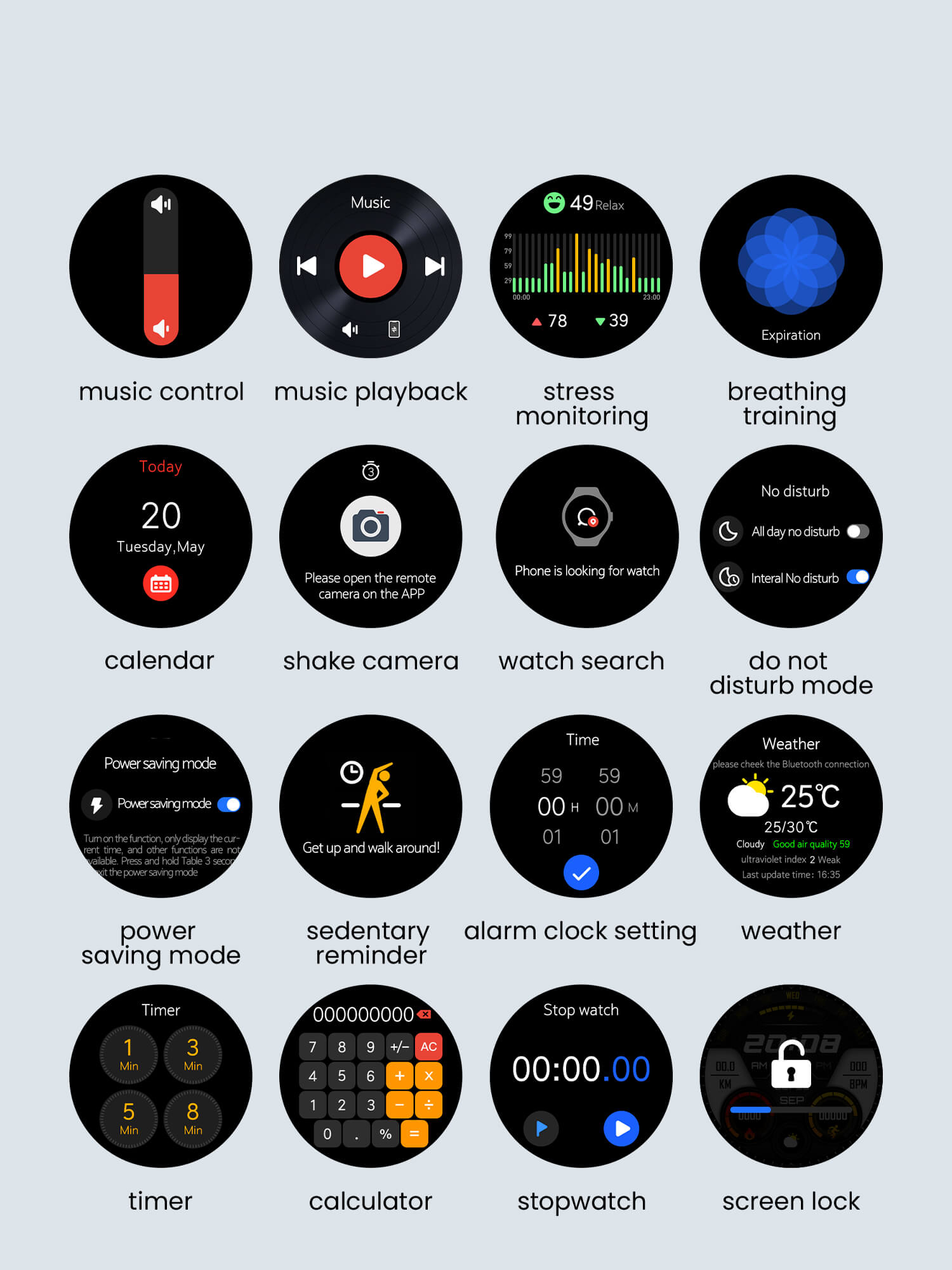 Fréquence cardiaque, SpO2, enregistrement des mouvements, respiration, pression, enregistrement de la respiration, minuterie, alarme, chronomètre, calculatrice, calendrier, météo, santé des femmes, recherche de votre téléphone, appel Bluetooth, contrôle de la musique, lecture de la musique, rappel des messages de l'application, rappel des appels entrants, rappel de la santé.