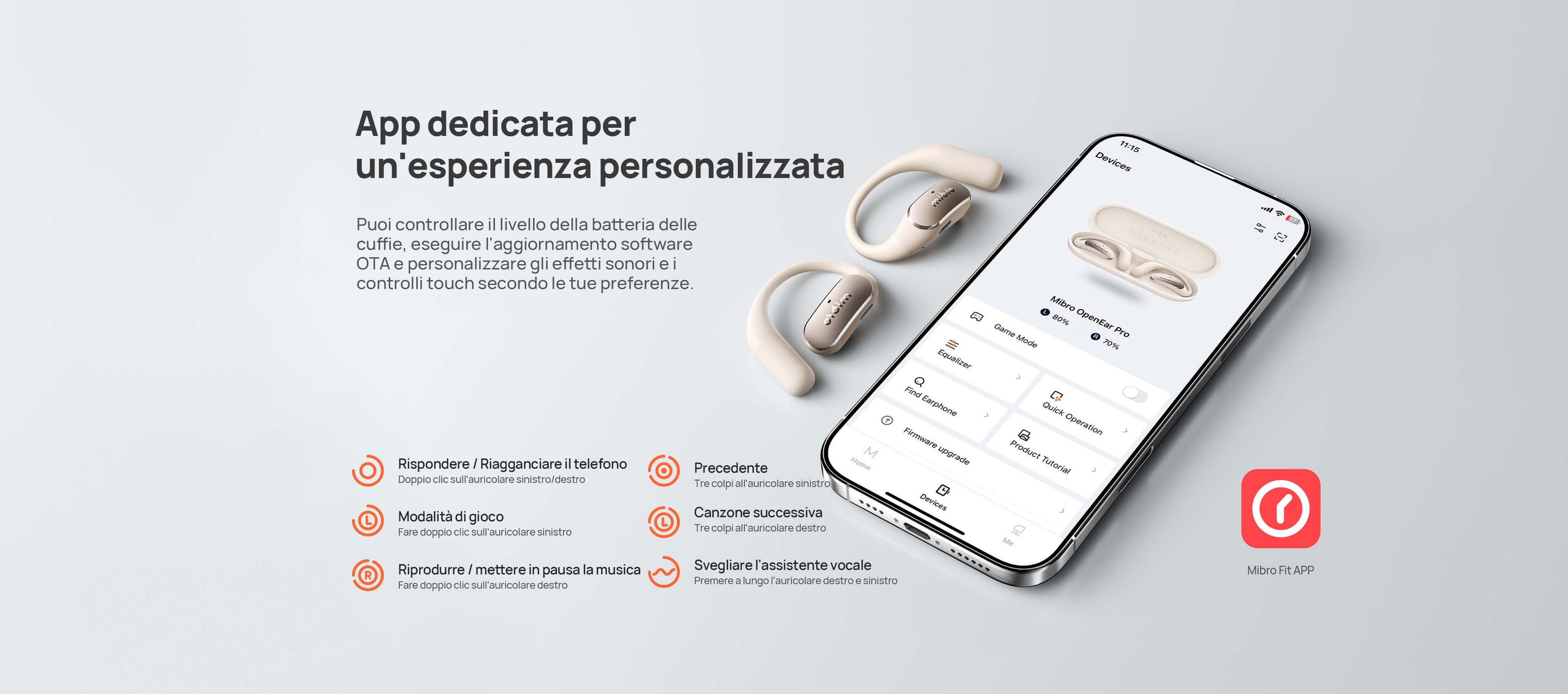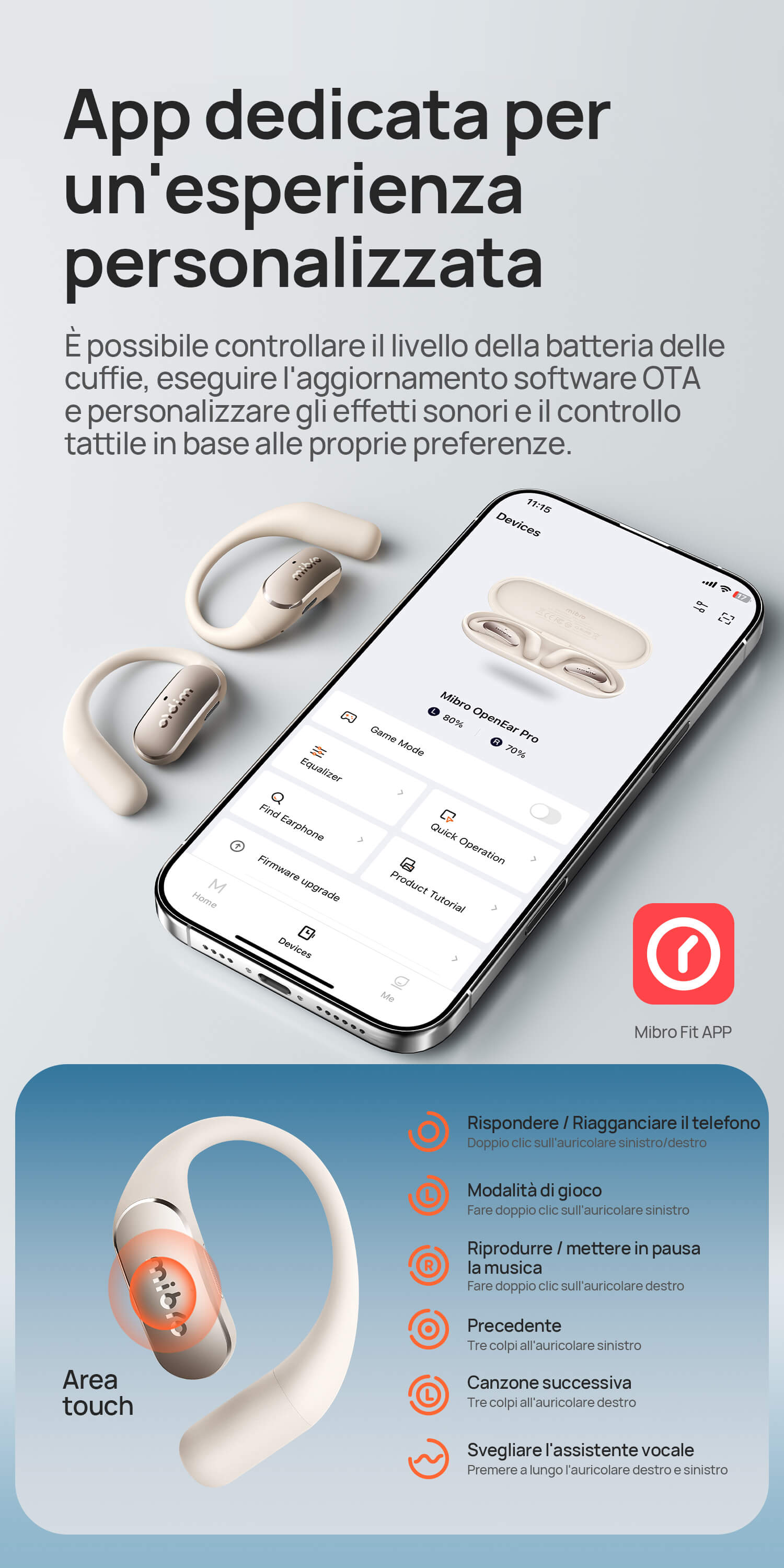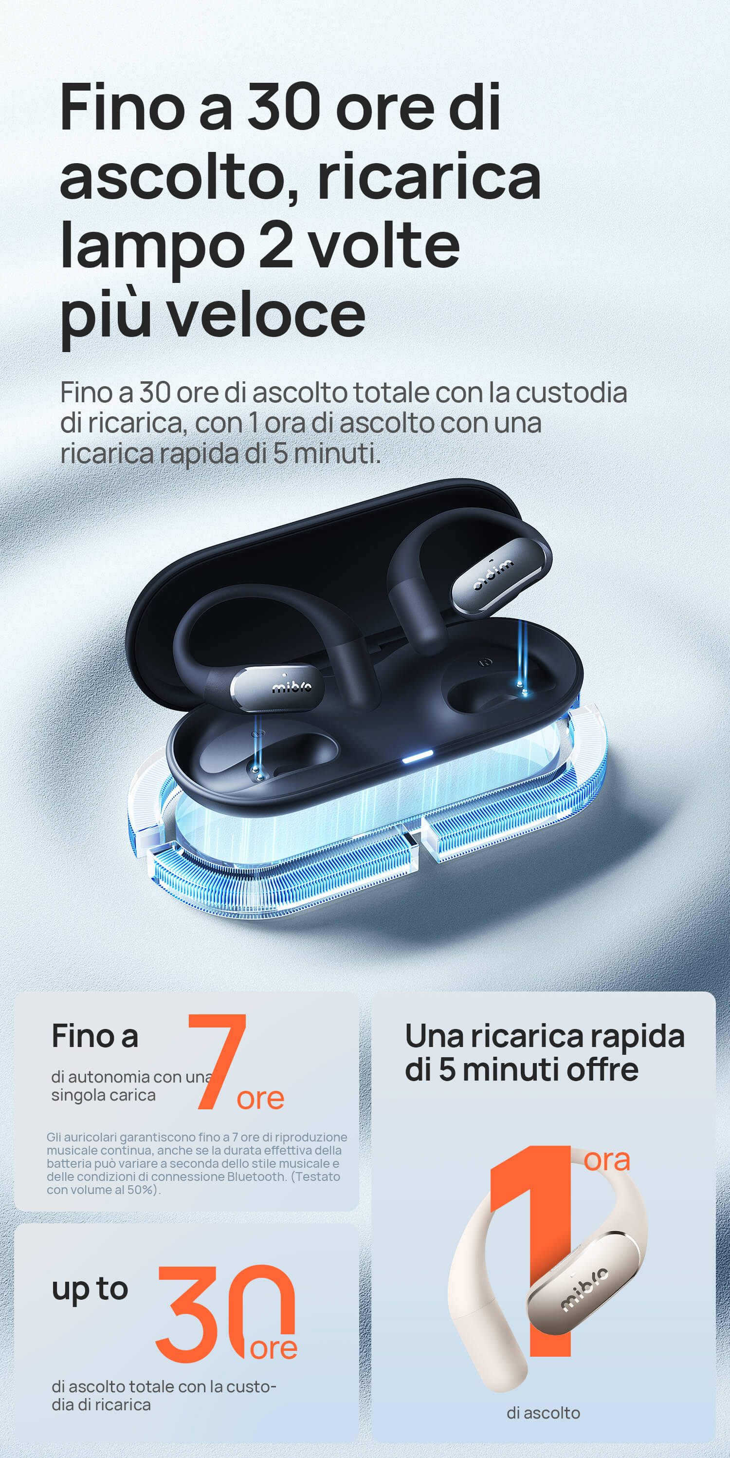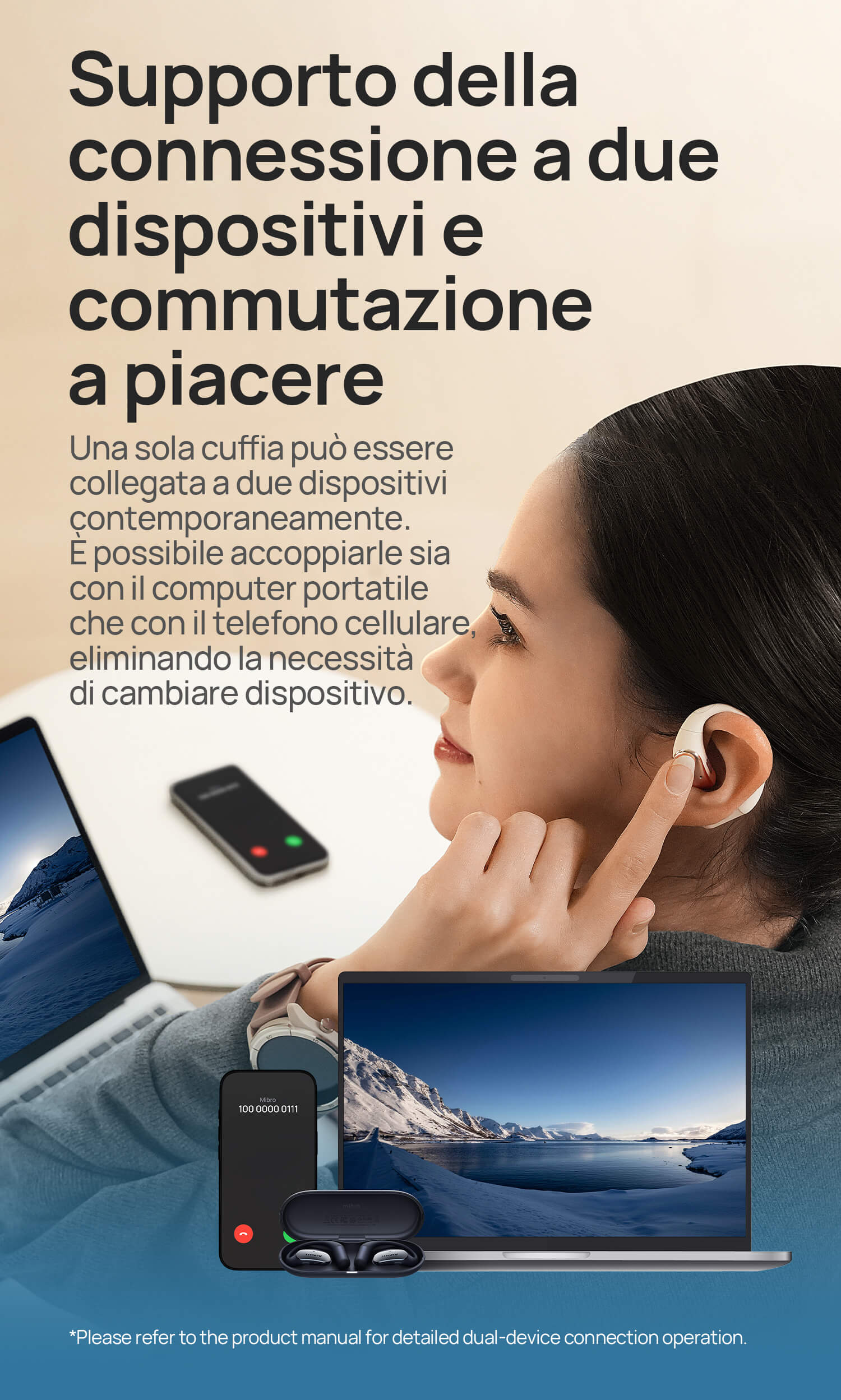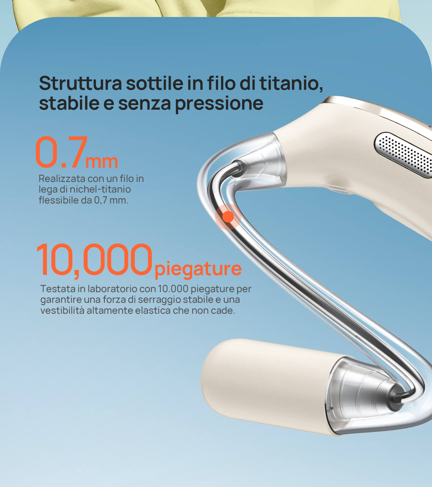 Solo 7,2g con struttura open-ear senza pressione. I ganci in titanio sottile e silicone molecolare sono ipoallergenici e antiscivolo.