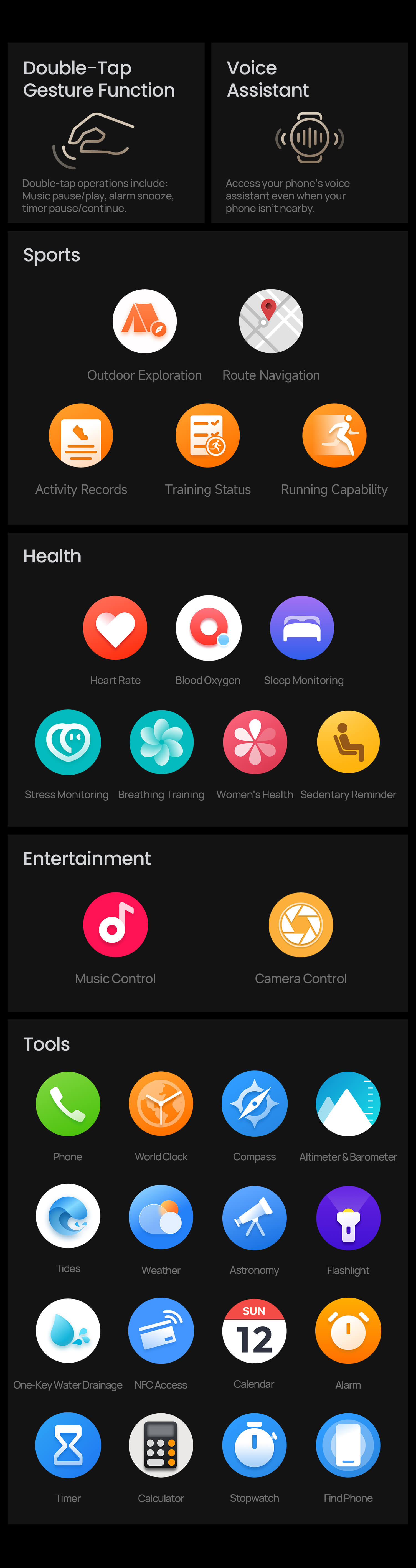 Essential Tools: Integrated compass, blood oxygen meter, barometer, weather alerts, lunar phase, and other tools to tackle various outdoor challenges.