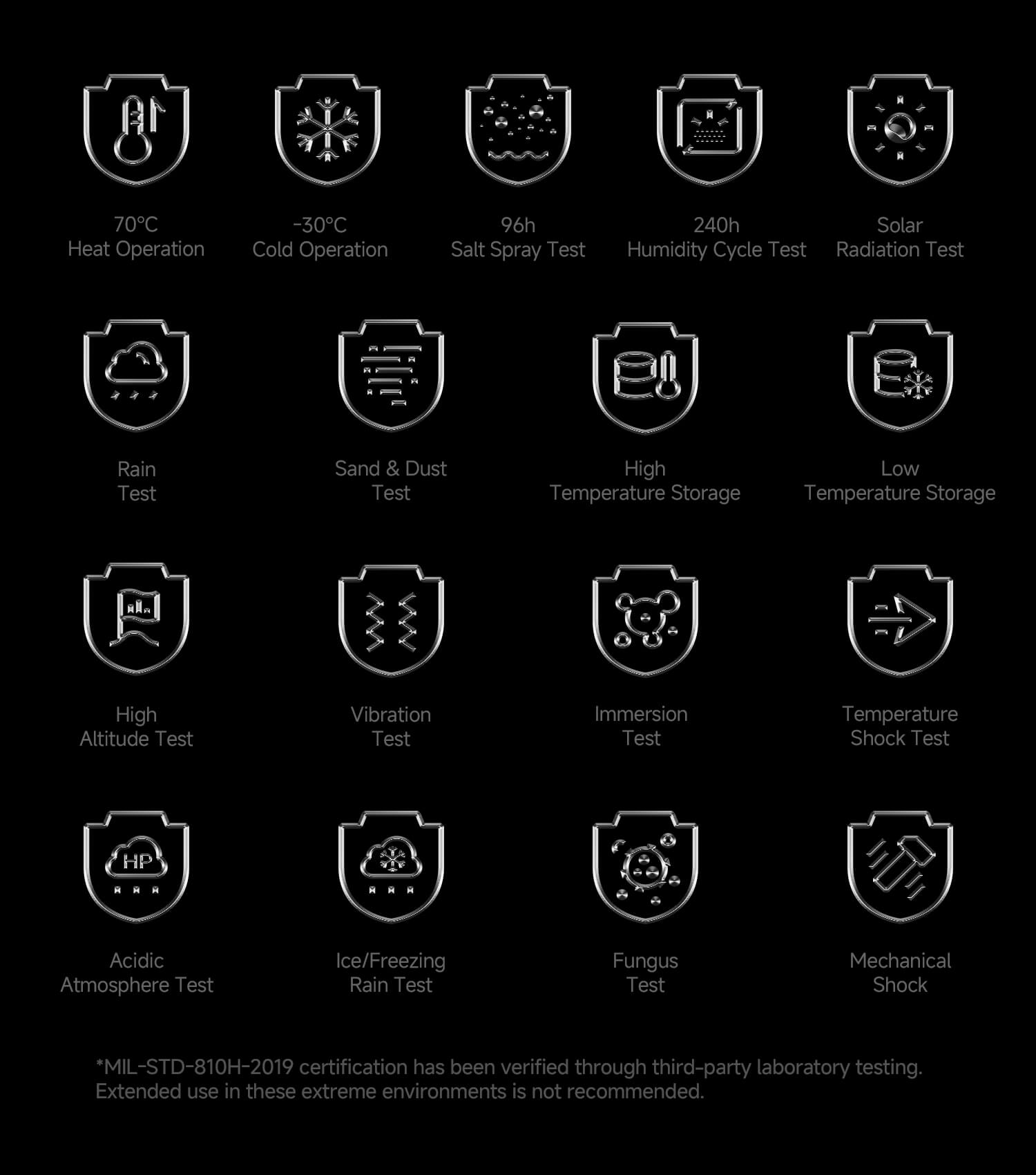 Military-Grade Quality, Freedom to Explore. Complies with 17 military-grade specifications under MIL-STD-810H-2019, ensuring reliable performance whether in scorching deserts, humid rainforests, snowy peaks, or polar ice sheets.