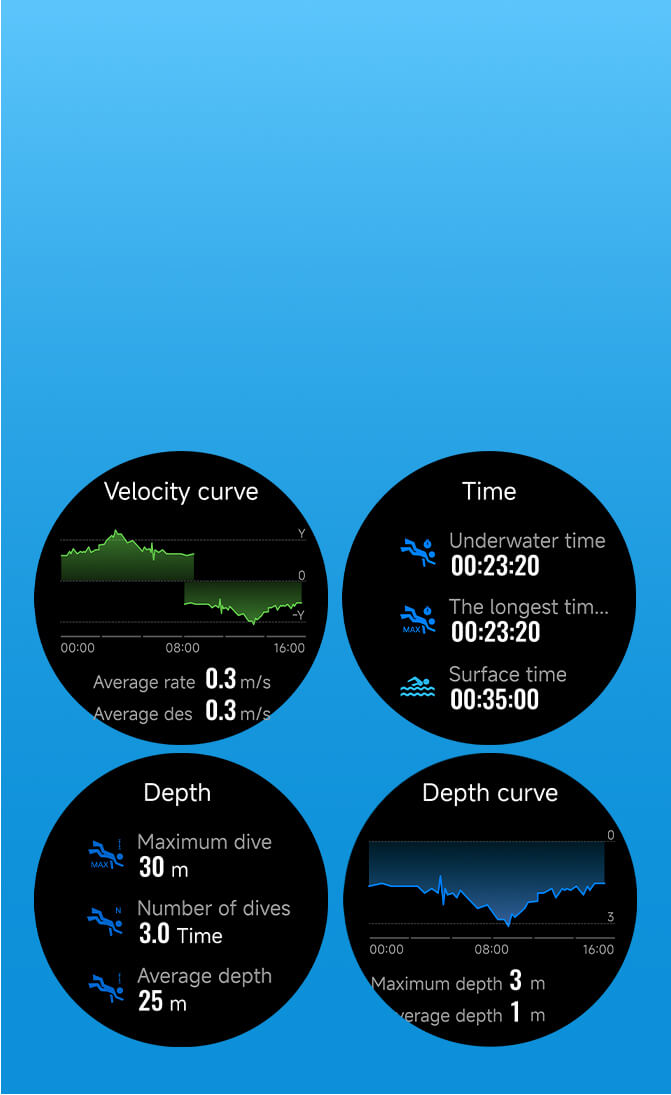 Track your dive in real-time with key metrics like ascent and descent speeds, current depth, maximum depth, dive time, dive count, and other professional indicators.