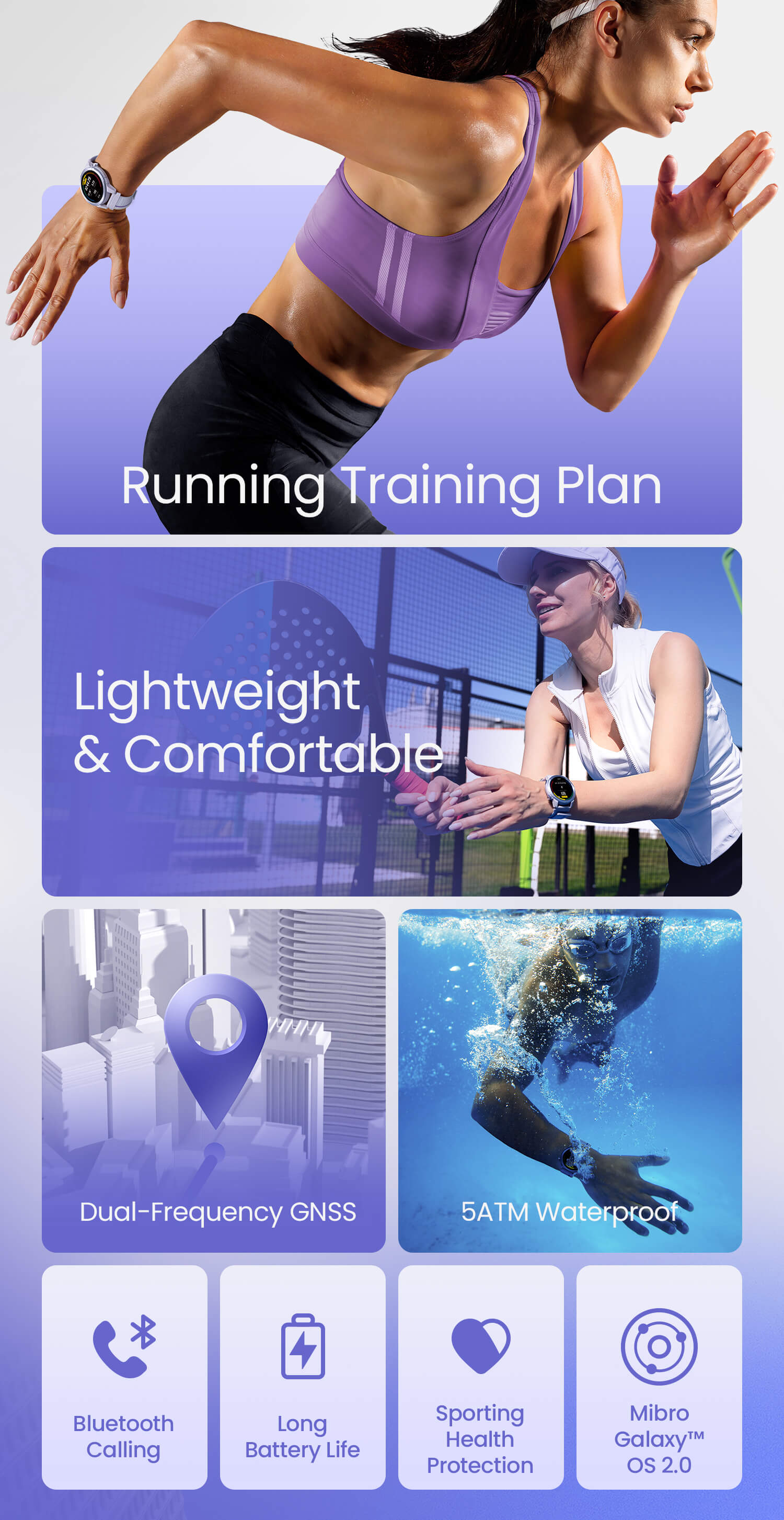 Powered by Mibro Galaxy OS 2.0 for personalized watch faces, sports data sync (Strava, Apple Health, Google Fit), Bluetooth calls, 150+ sports modes, and 5ATM water resistance (50m).