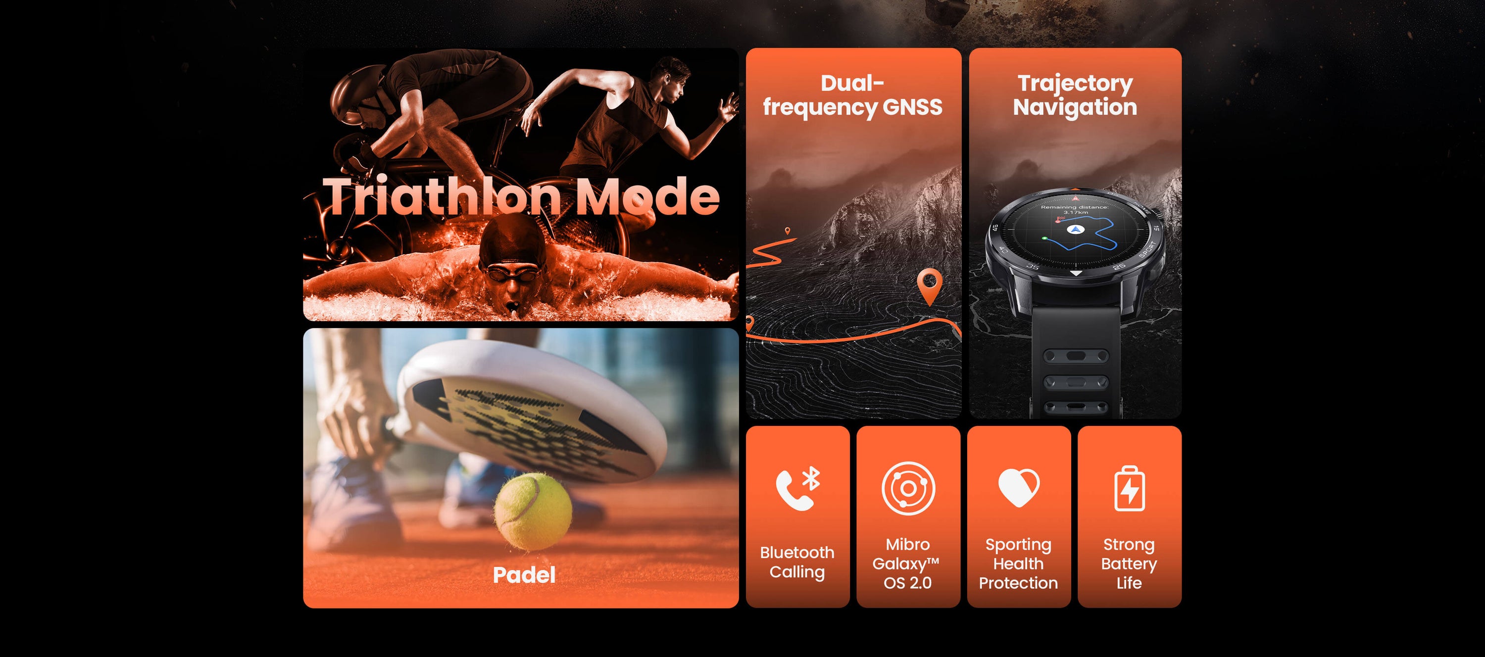 Dedicated mode with auto-transition (swim/bike/run), multi-distance support (Sprint/Olympic/Free), and unified data analysis. Plus, 150+ sport modes including specialized Padel stroke analysis.